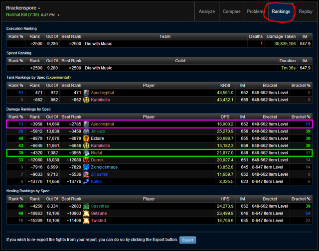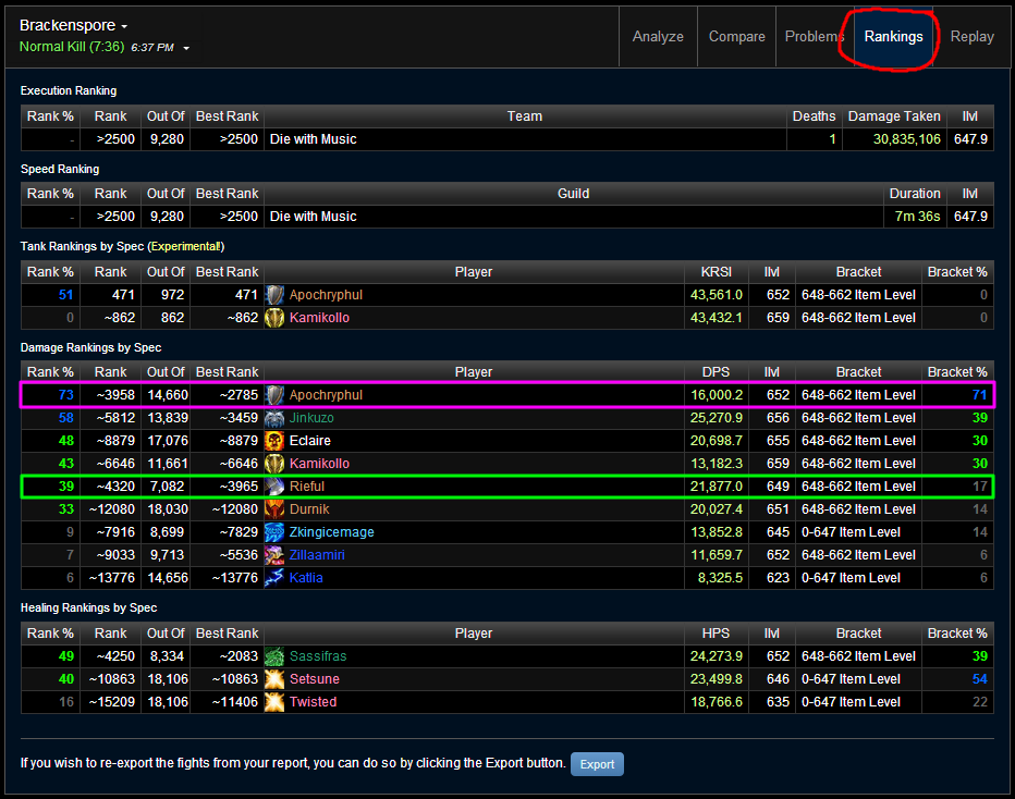 Now the real nice way to see how you are performing in comparison to all the other people of your class and spec and gear bracket is by viewing the Rankings tab circled at the top. This can be very useful for analyzing how you're performing in comparison to other people of your role, rather than to just the other DPSers/Healers in your raid. Since we all know some classes are stronger for some fights over others, it's easy to think that an Warrior doing 25k DPS is performing better than a SPriest doing only 20k DPS, but rankings may actually tell you that the priest is performing on par for his/her spec on that fight.