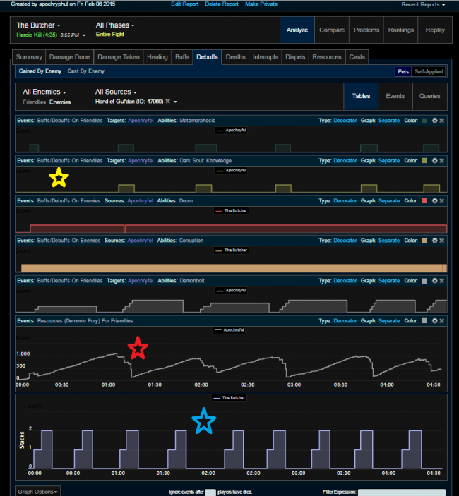 1) So the first two rows track my Metamorphosis and Dark Soul buffs.  I popped Meta 6 times and DS 5 times.  At the YELLOW STAR, you can see I popped Meta during my opener but I didn't pop DS.  Because DS is a minute CD with 2 charges, I had enough time to pair it with my Meta but I didn't.  This was an issue on Butcher and because of the way I made the layout, I could look at Kargath briefly and see the same issue.  Now I have one area I can try to improve on