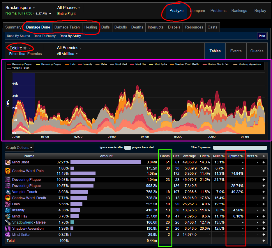 In the magenta highlighted area, you'll be able to analyze at which points in the fight you were using each of your abilities. Clicking on a spell at the top, for example "Devouring Plague", would toggle the visibility of that ability on the graph. So for instance if I want to see at which points I had Shadow Word: Pain up, I would make sure only Shadow Word: Pain was highlighted and I could then see the parts of the fight where I failed to keep it up.