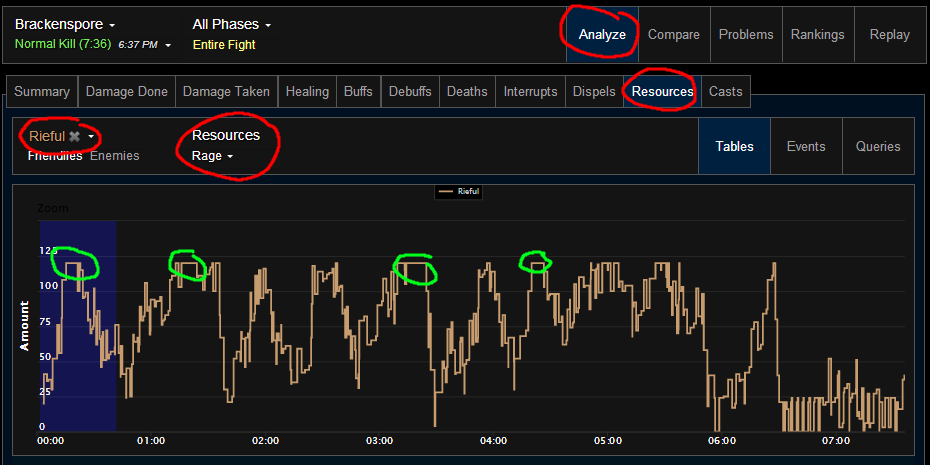 Another cool thing for energy, rage, and mana users (healer) that you can see is how well you utilized your resources throughout the fight. Circled at the top is how you'd navigate to a screen like this. I'm using Rieful (dpsing) as an example since warriors use rage.