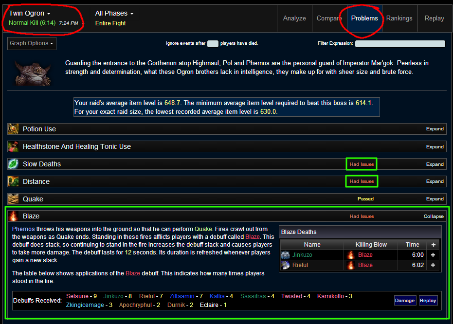 A real cool feature of Warcraft Logs is that you can actually see where you had problems for any particular boss attempt. Here is a view of the Twin Ogron attempt for our kill on Sunday as example. Circled at the top is the tab for "Problems" which would take you to this kind of view.