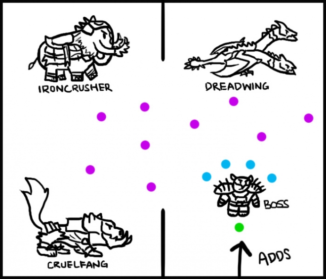 There's no real purpose to this diagram since the fight isn't explained very well visually, but Apoc wanted more diagrams so here ya go. Purple is ranged, Blue is melee, Green is tanks. This can serve as our placeholder strategy post!